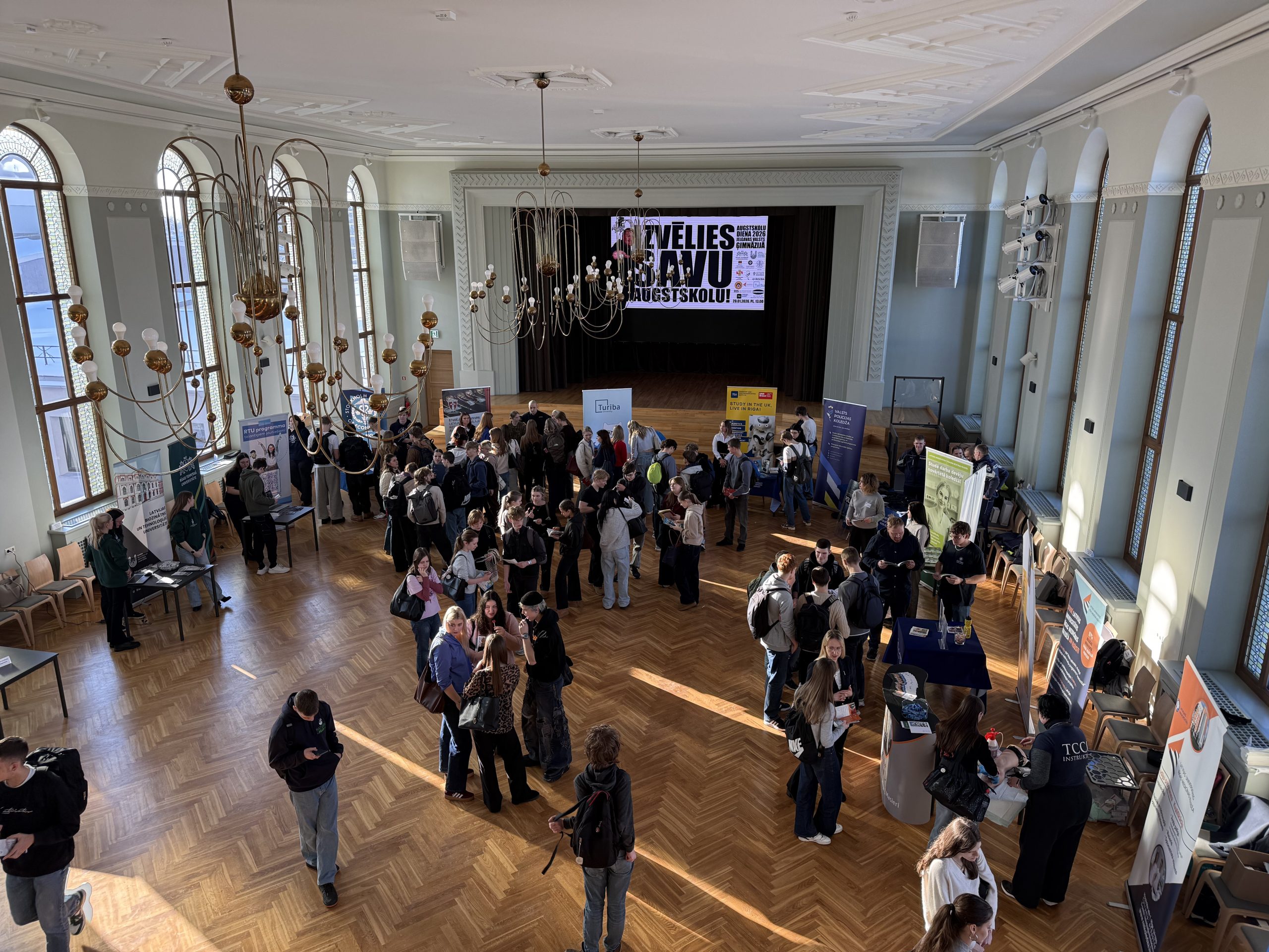 Augstskolu un koledžu pārstāvji radoši noformētos stendos sniedza aktuālu informāciju par piedāvātajām studiju programmām, iestāšanās nosacījumiem, studiju procesu, budžeta vietu pieejamību un nepieciešamajām priekšzināšanām.