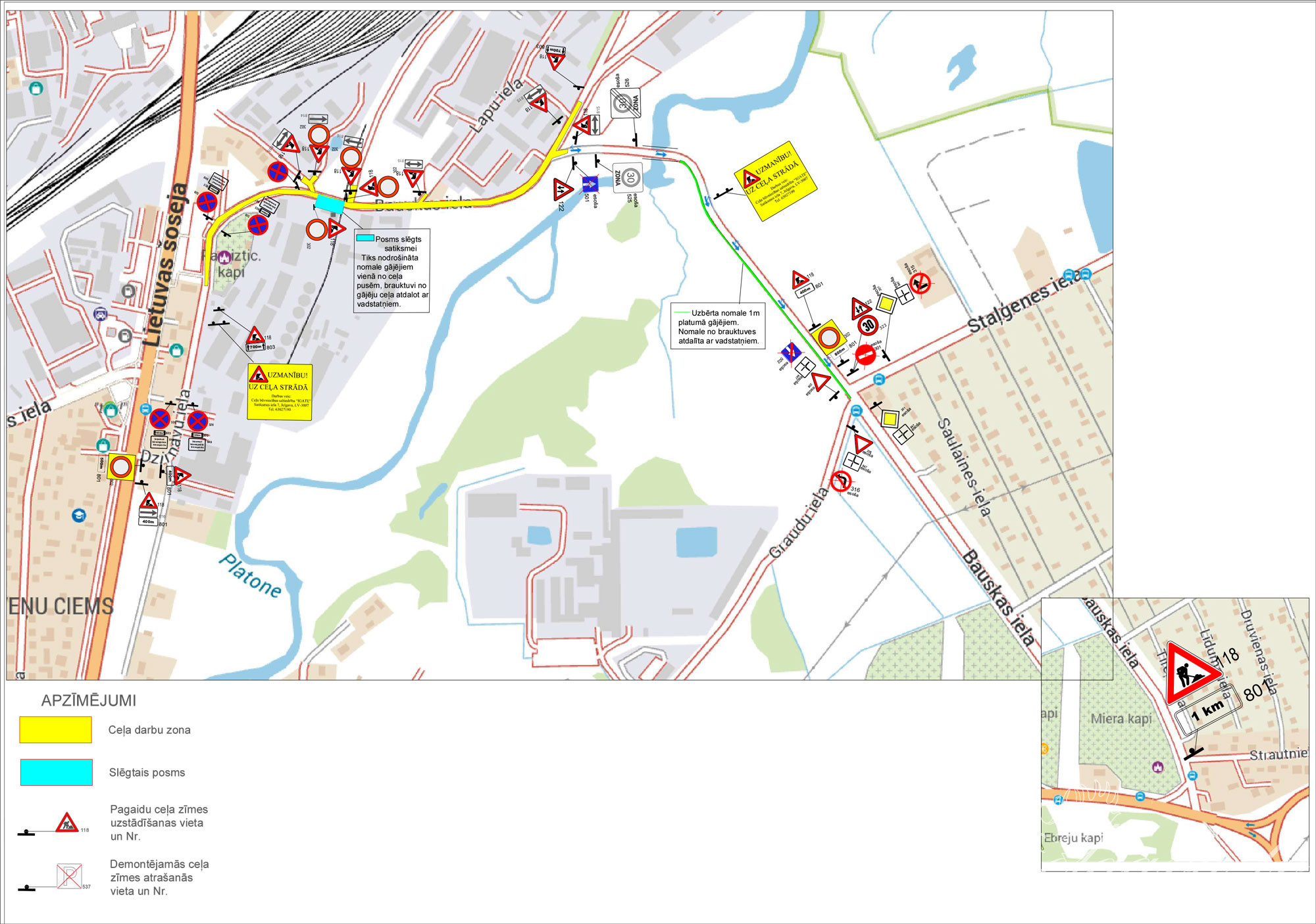 Slēgtajā posmā gājēju kustība būs nodrošināta pa vienu ielas malu, gājēju zonu atdalot ar vadstatņiem. Satiksme šajā posmā tiks organizēta ar pagaidu ceļa zīmēm. Apbraukšana iespējama pa Graudu ielu, tādēļ aicinām autovadītājus rēķināties ar papildu laiku.