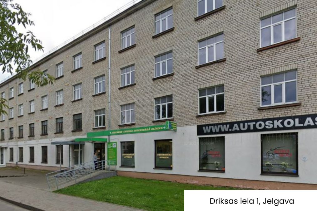 • Driksas iela 1, Jelgava – dienesta viesnīca (3671,90 m²) un zemes vienība 0,2765 hektāri. Nosacītā sākuma cena: 173 000 eiro.