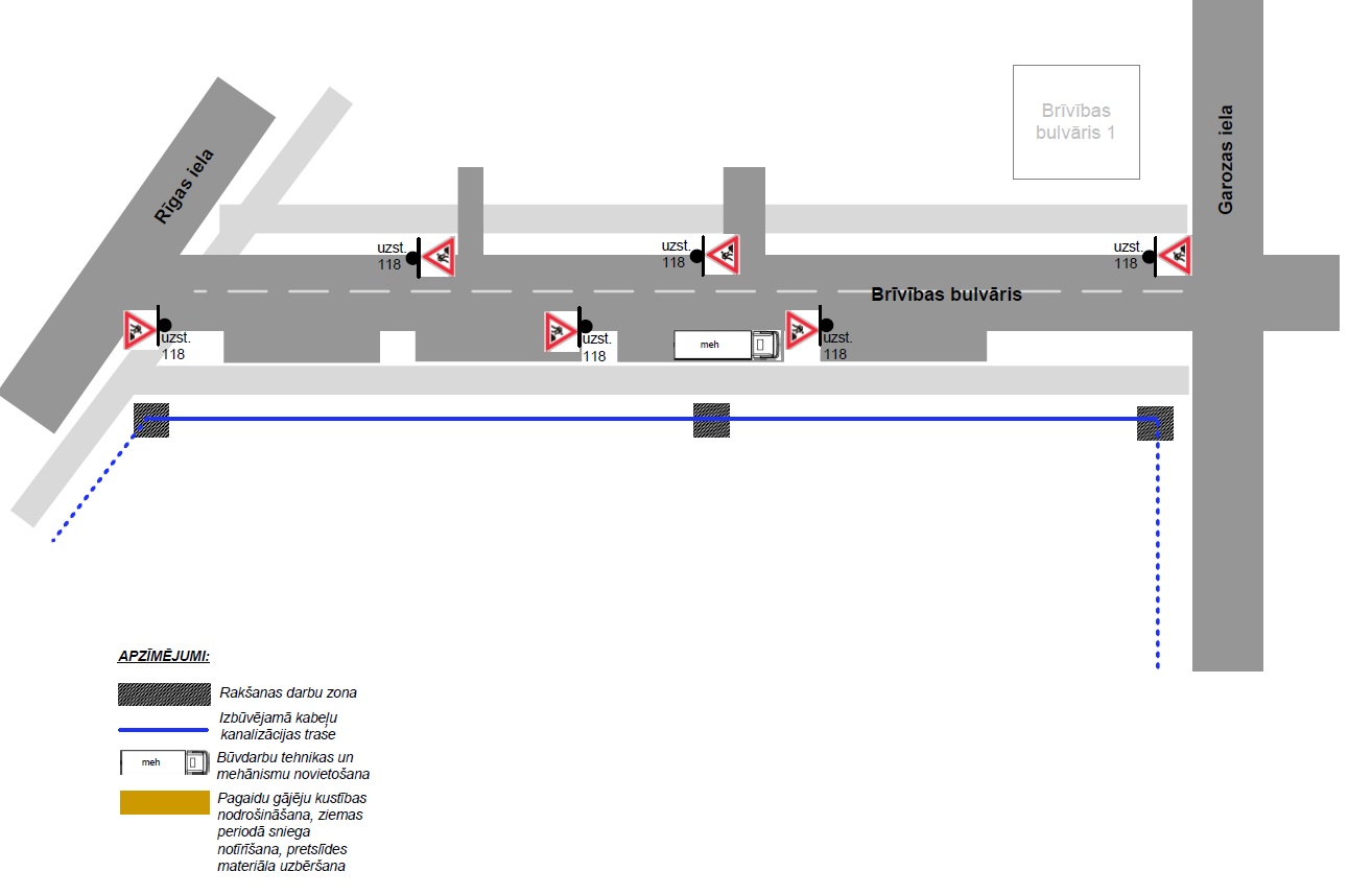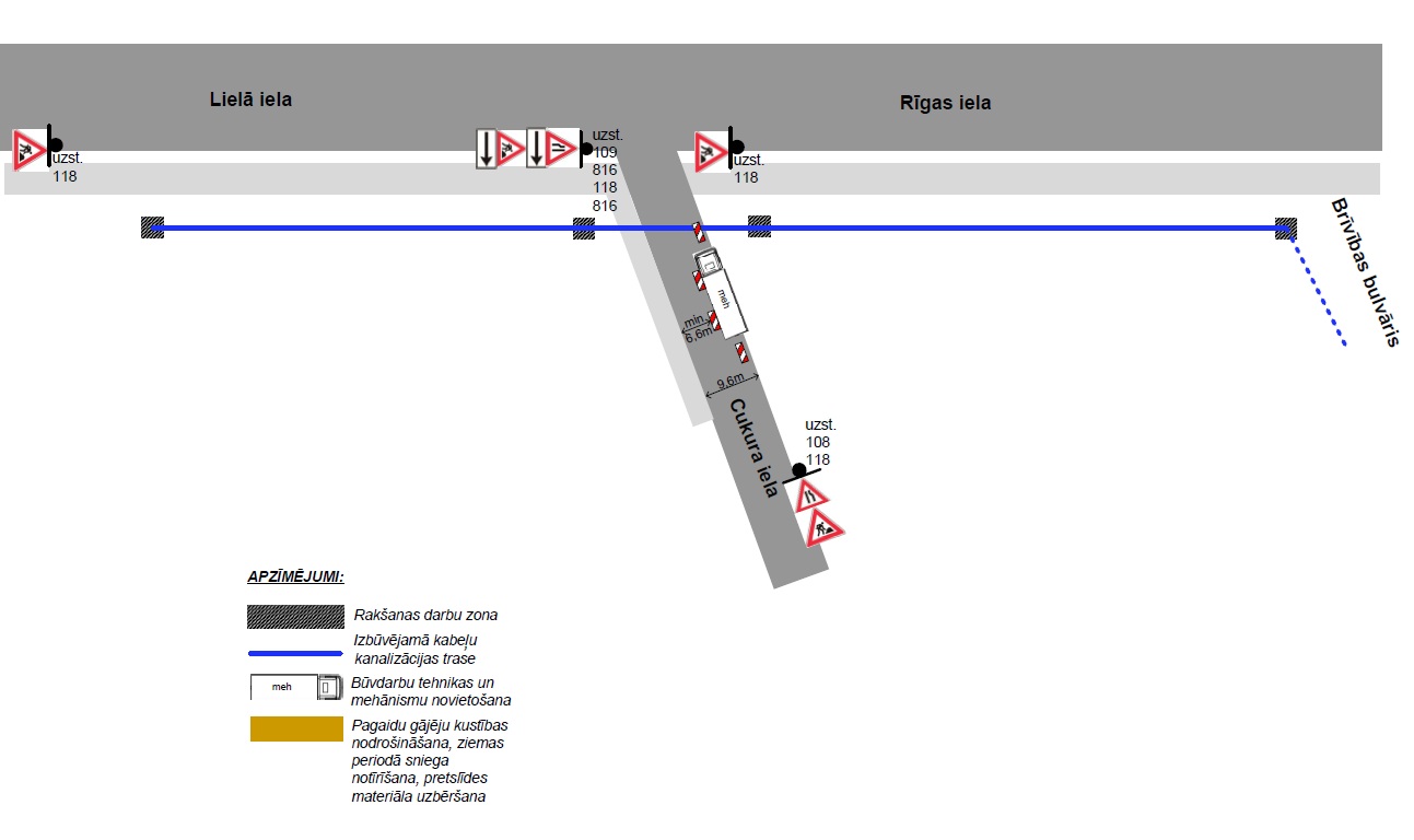 Lai veiktu vājstrāvas tīklu būvdarbus, tiks ierobežota satiksmes kustība Cukura ielā, Rīgas ielā un Brīvības bulvārī, sašaurinot brauktuvi.