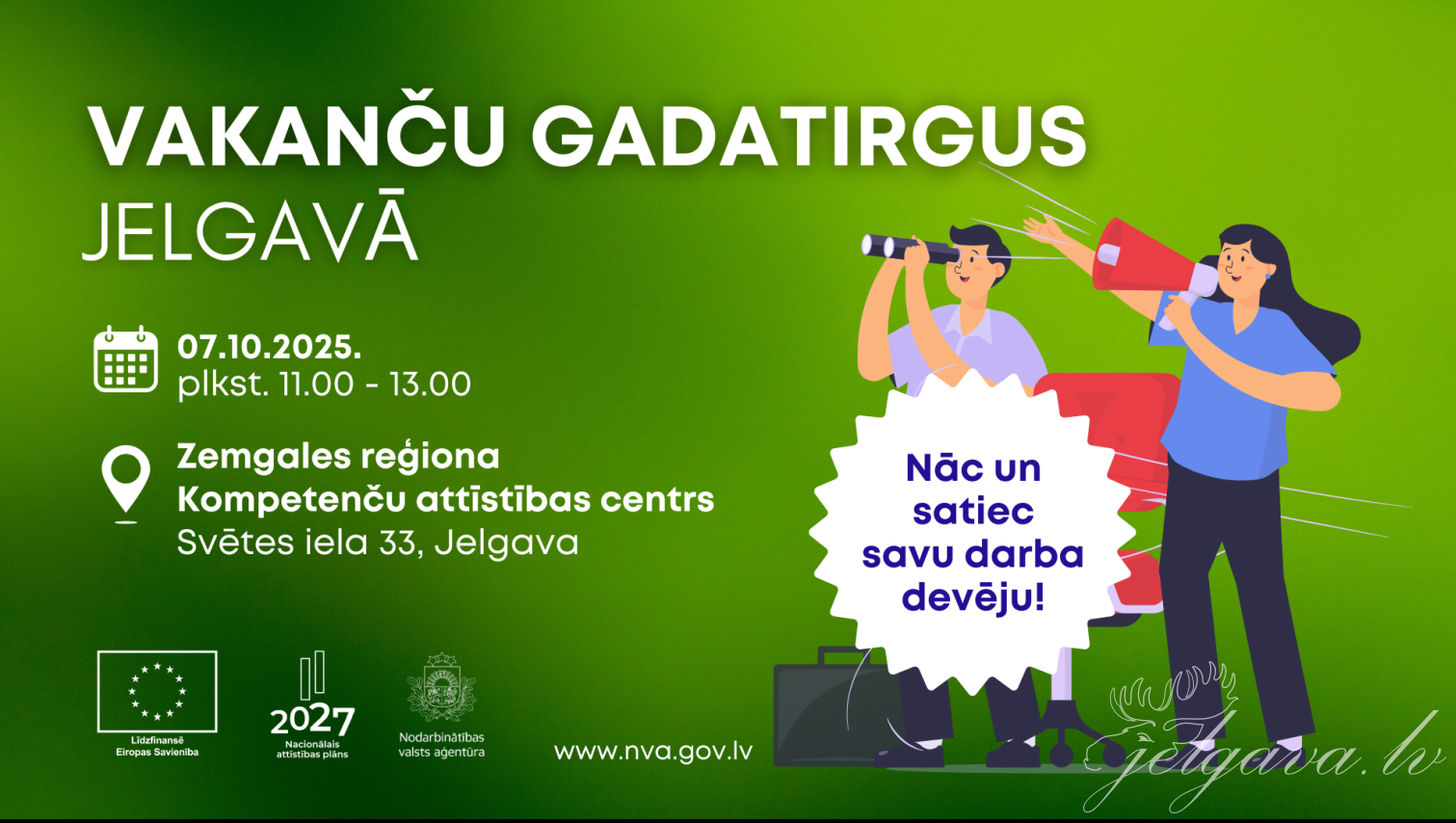 7. oktobrī no pulksten 11 līdz 13 Zemgales reģiona Kompetenču attīstības centrā (Svētes ielā 33) norisināsies Nodarbinātības valsts aģentūras (NVA) Vakanču gadatirgus. Pasākuma gaitā darba meklētājiem būs iespēja vienuviet iepazīties ar darba devēju vairāk nekā 200 aktuālajām vakancēm, darba nosacījumiem un karjeras izaugsmes iespējām. Pasākuma apmeklējums ir bez maksas.