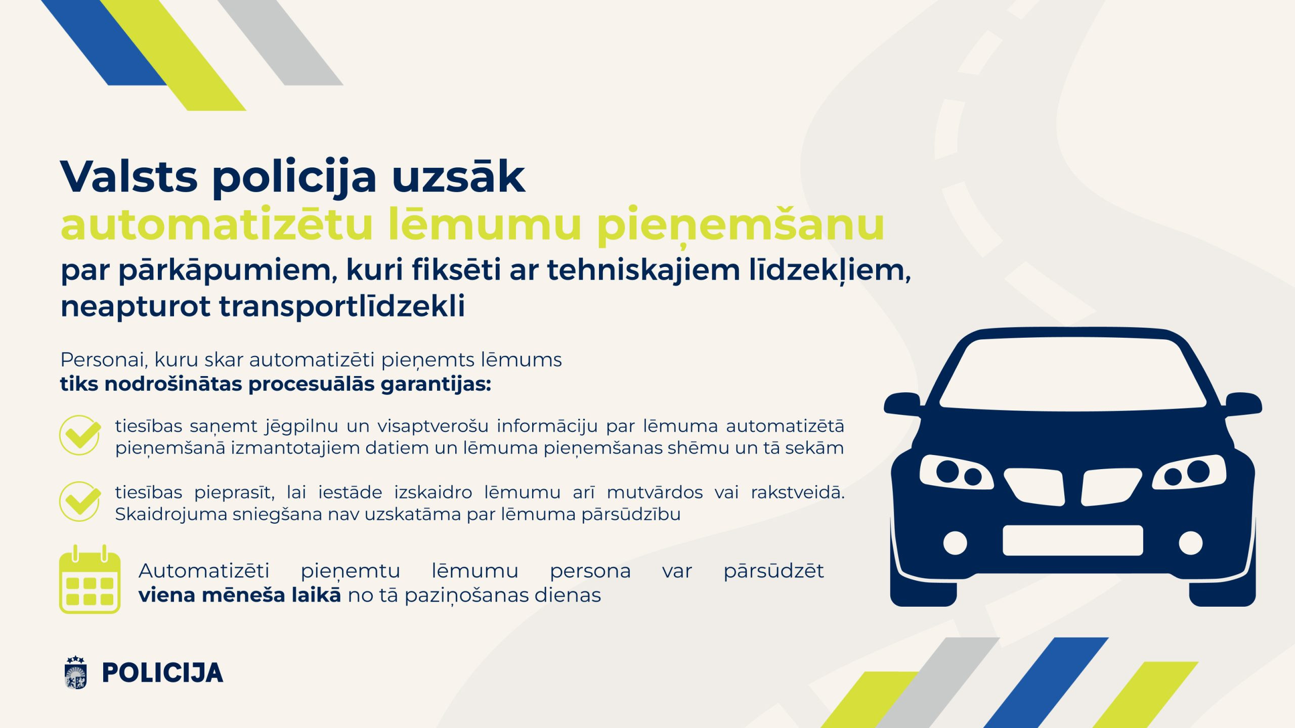 No ceturtdienas, 11. decembra, Valsts policija uzsāks automatizētu lēmumu pieņemšanu par pārkāpumiem, kuri fiksēti ar tehniskajiem līdzekļiem, neapturot transportlīdzekli, tādiem kā – pārvietojamie un stacionārie fotoradari, 360 grādu kameru sistēmas un vidējā ātruma kontroles radari. Automatizēti pieņemtos lēmumus personām būs tiesības pārsūdzēt viena mēneša laikā no tā paziņošanas brīža.