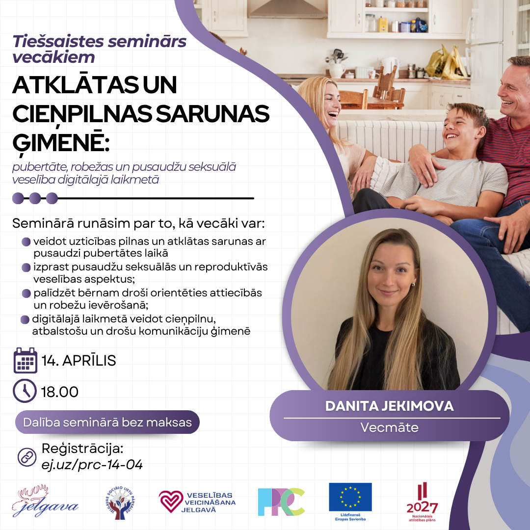Tiešsaistes semināru vadīs vecmāte Danita Jekimova. Tā laikā tiks aplūkoti pusaudžu seksuālās un reproduktīvās veselības jautājumi, personīgo robežu nozīme, kā arī praktiski ieteikumi, kā digitālajā laikmetā veidot atklātu, saprotošu un atbalstošu komunikāciju ģimenē.