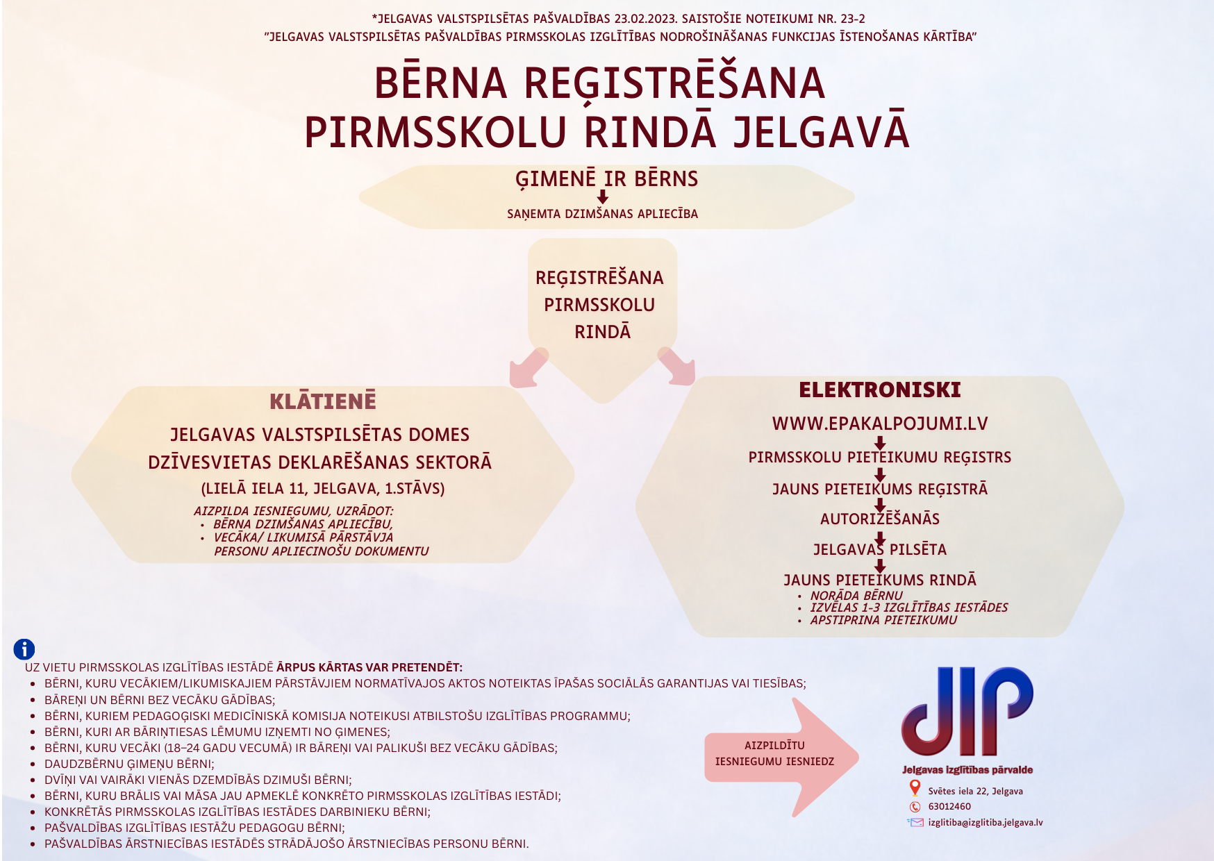 Informācija par bērna reģistrēšanas kārtību un vietu piešķiršanu pirmsskolas izglītības iestādēs Jelgavas valstspilsētā ir pieejama Jelgavas valstspilsētas pašvaldības 23.02.2023. saistošajos noteikumos Nr. 23-2 “Jelgavas valstspilsētas pašvaldības pirmsskolas izglītības nodrošināšanas funkcijas īstenošanas kārtība” – Jelgavas valstspilsētas pašvaldības pirmsskolas izglītības nodrošināšanas funkcijas īstenošanas kārtība.