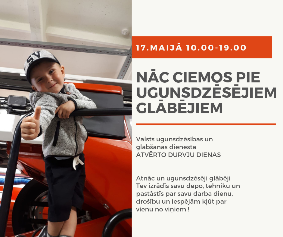Atzīmējot Ugunsdzēsēju un glābēju dienu un ugunsdzēsības Latvijā 154.gadadienu, Valsts ugunsdzēsības un glābšanas dienests jau septīto gadu pēc kārtas 17.maijā rīkos Atvērto durvju dienu visās VUGD daļās un posteņos, kā arī Ugunsdrošības un civilās aizsardzības koledžas Praktisko mācību nodaļā.