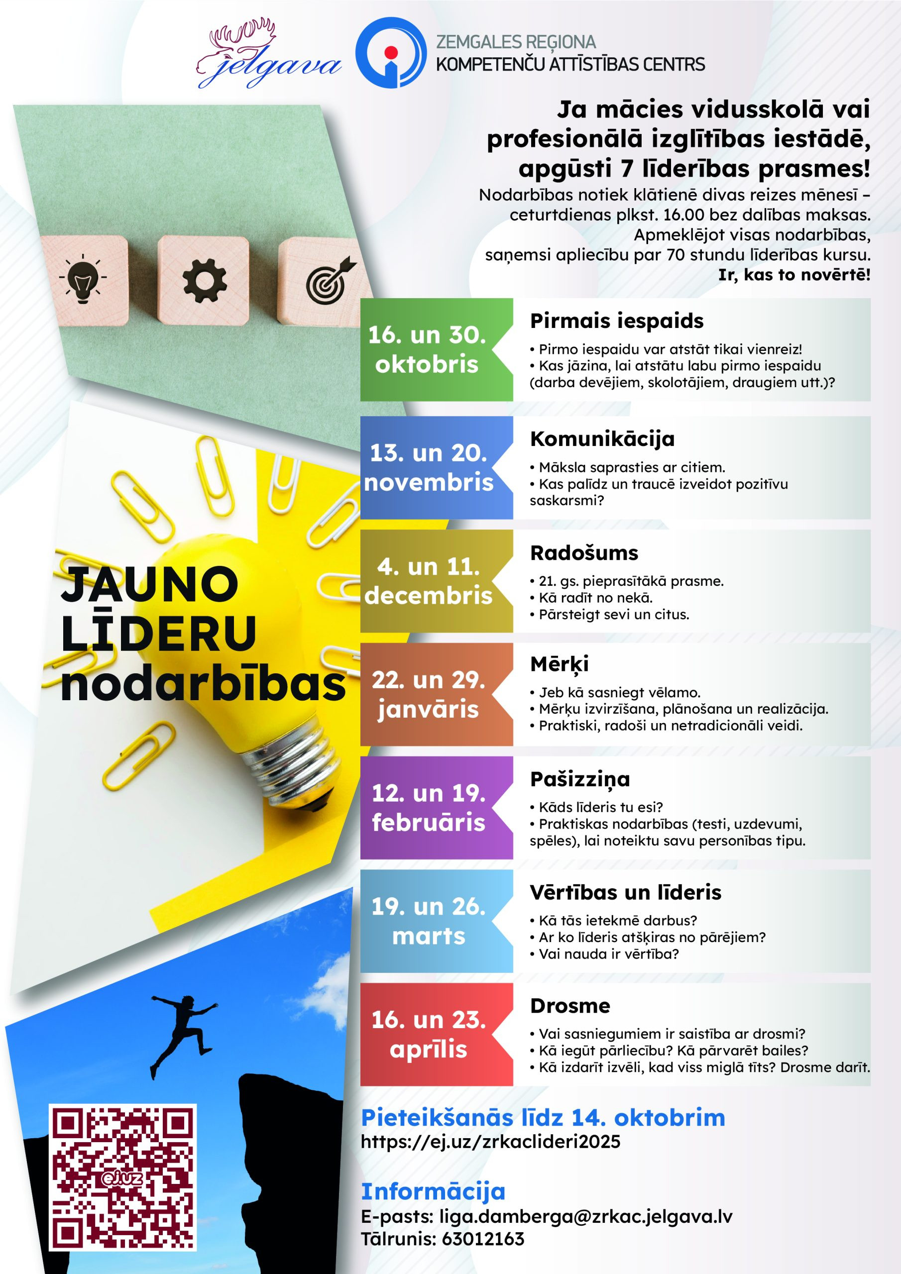 Zemgales reģiona kompetenču attīstības centrs (ZRKAC) aicina vidusskolu un profesionālās izglītības iestāžu jauniešus pieteikties “Jauno līderu nodarbībām”, lai praktiski apgūtu nepieciešamās līderības prasmes. Nodarbības notiks klātienē divas reizes mēnesī, ceturtdienās pulksten 16. “Jauno līderu nodarbībām” jāpiesakās līdz 14. oktobrim.