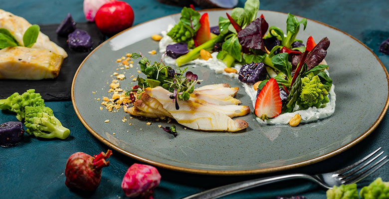 Restorānu pamatēdienu piedāvājumā ir, piemēram, grilēta vistas fileja, pildīta ar ķiploku ziediem un kazas sieru, pasniegta ar kartupeļu klimpām un kaņepju sviestu; strausa fileja, jauno burkānu biezenis, biešu biezenis, brokoļu biezenis, sarkanvīna-aveņu mērce; asinsdesas ar reducētu saldo jāņogu mērci, saldo kartupeļu biezeni, kressalātiem; zaļumu buljonā sautēts zutis ar violeto kartupeļu biezeni, svaigām un sezameļļā marinētām jūras zālēm, pasniegts ar krāsnī ceptu tomātu zaļumu grozā, lauku skābā krējuma-diļļu mērci.