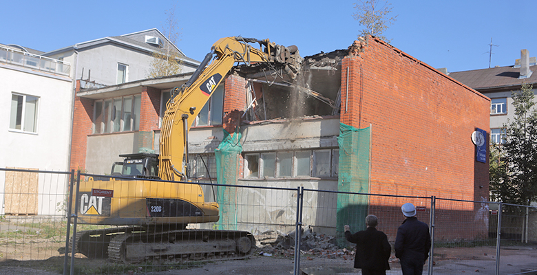 Ēka Katoļu ielā 2a blakus centrālajai pasta nodaļai vairs neapdraud garāmgājējus un nebojā skatu – tā šonedēļ tiek nojaukta.