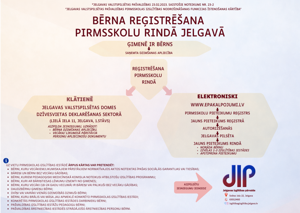 Vietu piešķiršana un bērnu uzņemšana Jelgavas valstspilsētas pašvaldības pirmsskolas izglītības iestādēs notiek saskaņā ar Jelgavas valstspilsētas pašvaldības 2023. gada 23. februāra saistošajiem noteikumiem Nr. 23-2 “Jelgavas valstspilsētas pašvaldības pirmsskolas izglītības nodrošināšanas funkcijas īstenošanas kārtība”.