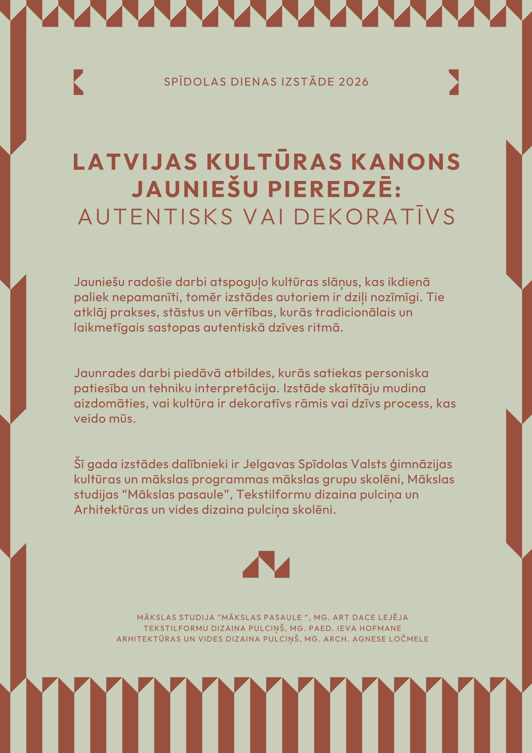 Jauniešu radošie darbi atspoguļo kultūras slāņus, kas ikdienā paliek nepamanīti, tomēr viņiem ir dziļi nozīmīgi. Tie atklāj prakses, stāstus un vērtības, kurās tradicionālais un laikmetīgais sastopas autentiskā dzīves ritmā. Jaunrades darbi piedāvā atbildes, kurās satiekas personiska patiesība un tehniku interpretācija. Izstāde skatītāju mudina aizdomāties, vai kultūra ir dekoratīvs rāmis, vai dzīvs process, kas veido mūs? Šī gada izstādes dalībnieki ir Jelgavas Spīdolas Valsts ģimnāzijas kultūras un mākslas programmas mākslas grupu skolēni, Mākslas studijas “Mākslas pasaule”, tekstilformu dizaina pulciņa un arhitektūras un vides dizaina pulciņa skolēni. Mākslas studija ”Mākslas pasaule “– Mg. art Dace Lejēja. Tekstilformu dizaina pulciņš – Mg. paed. Ieva Hofmane. Arhitektūras un vides dizaina pulciņš – Mg. arch. Agnese Ločmele.