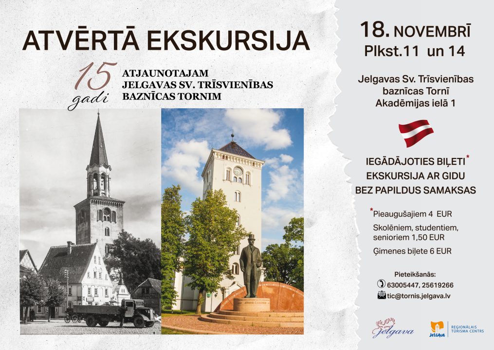 Vietu skaits ekskursijās ir ierobežots, tāpēc interesenti aicināti pieteikties pa tālruni 63005447 vai e-pastu tic@tornis.jelgava.lv