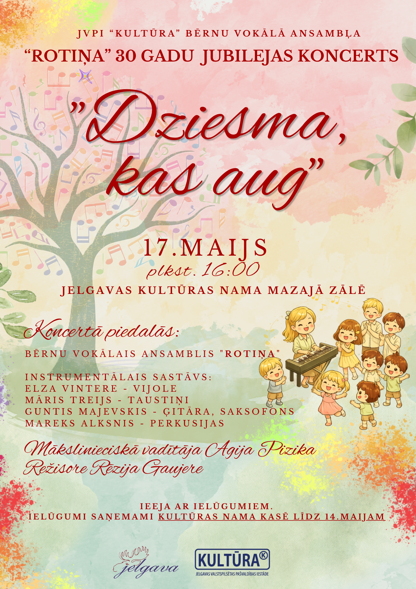 Koncertā piedalās bērnu vokālais ansamblis “Rotiņa”, instrumentālais sastāvs: Elza Vintere (vijole), Māris Treijs (taustiņi), Guntis Majevskis (ģitāra, saksofons), Mareks Alksnis (perkusijas). Mākslinieciskā vadītāja Agija Pizika. Režisore–Rēzija Gaujere. Sadziedāsim senas un jaunas ansambļa dziesmas. Bezmaksas ielūgumus kultūras nama kasē var saņemt no 21. aprīļa līdz 14. maijam.