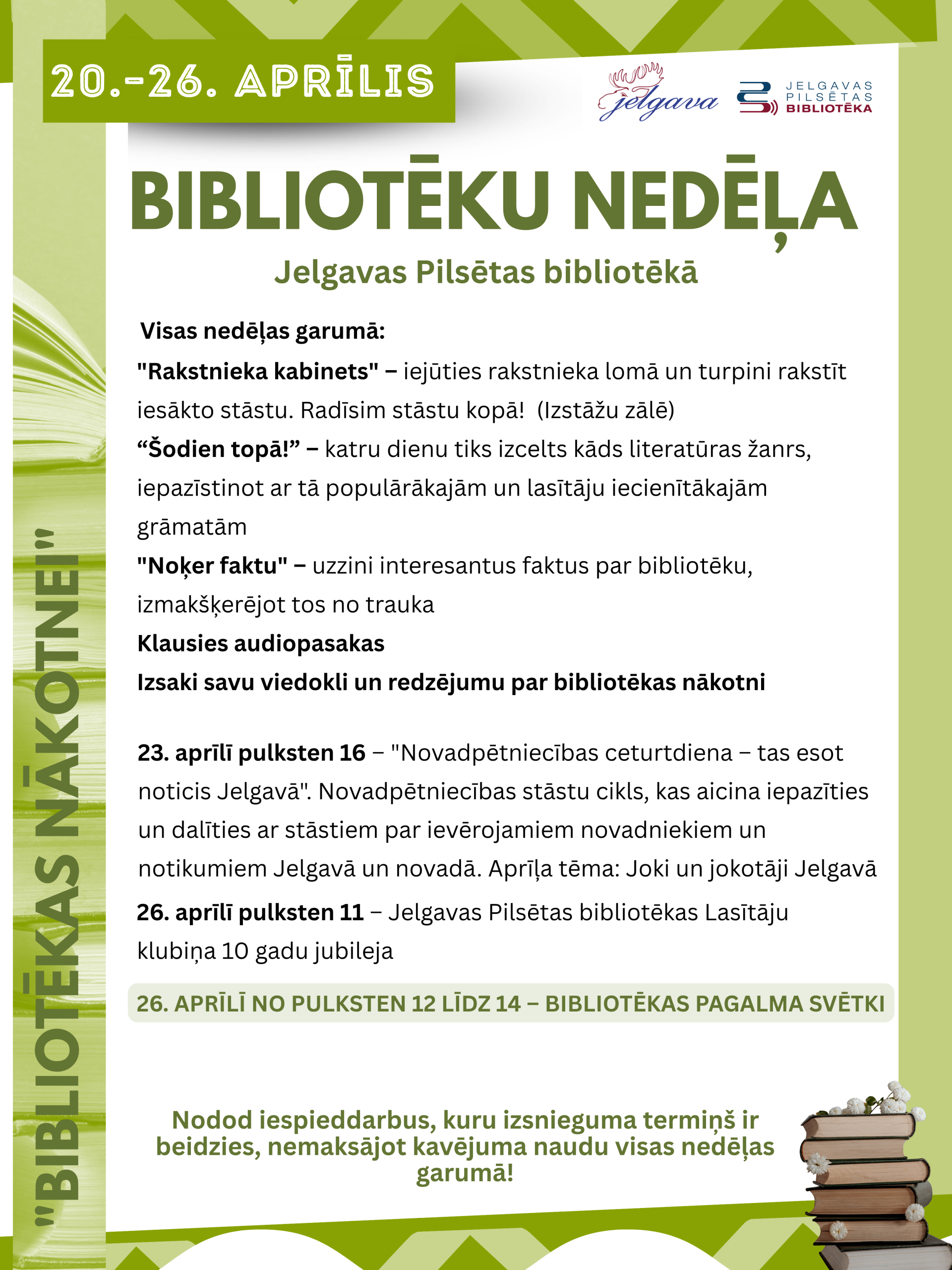 no 20.04. līdz 26.04. 10:00 | Jelgavas Pilsētas bibliotēka, Akadēmijas iela 26, Jelgava