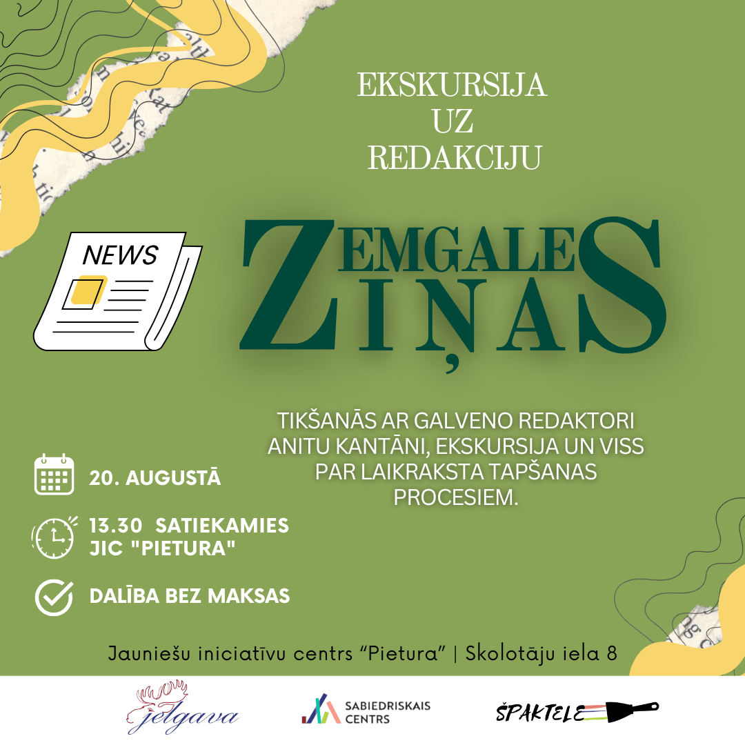 Jauniešiem būs iespēja doties uz Zemgales Ziņu redakciju, kurā jaunieši varēs uzzināt kā strādā mūsdienu mediji. Iepriekšēja pieteikšanās nav nepieciešama (satikšanās pulksten 13.20 pie Zemgales ziņu ēkas Peldu ielā 7).