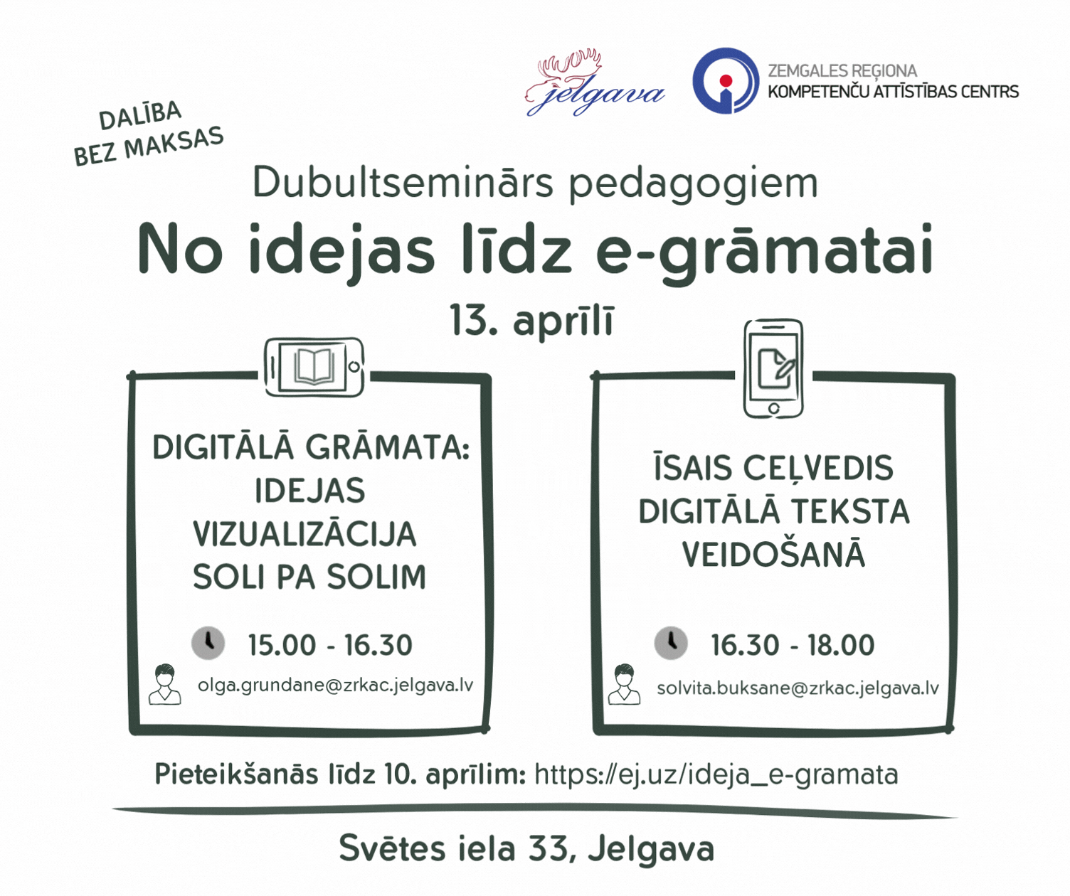 13.aprīlī plkst.15.00–18.00 Zemgales reģiona kompetenču attīstības centrā (ZRKAC) notiks dubultseminārs pedagogiem “No idejas līdz e-grāmatai”, kurā dalībnieki varēs apgūt digitālās grāmatas veidošanu tiešsaistes rīkos “Canva” un “Heyzine”, pārvēršot materiālus interaktīvā formātā, un pilnveidot zināšanas par mūsdienīgu profesionālu un lasītājam skaidri uztveramu tekstu veidošanas pamatprincipiem.