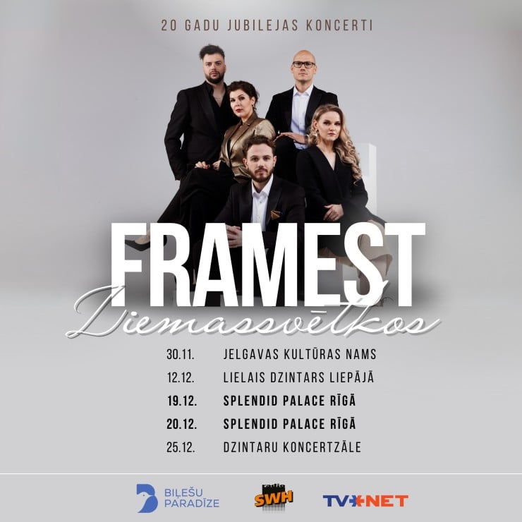 Šajā programmā tiks atskaņotas iemīļotas Ziemssvētku melodijas virtuozi daudzbalsīgā skanējumā. Visiem labi pazīstamajos meldiņos un populārajās Raimonda Paula dziesmās varēs saklausīt gan svētsvinīgu mieru, gan bērnišķīgu priecāšanos a cappella dziedājumā. Grupa darbojas kopš 2005. gada un šogad izdeva 20 gadu jubilejas albumu “2.0”. Grupa FRAMEST: Mikus Abaroniņš, Beāte Zviedre, Rūta Dūduma Ķirse, Jānis Ķirsis, Roberts Memmēns.