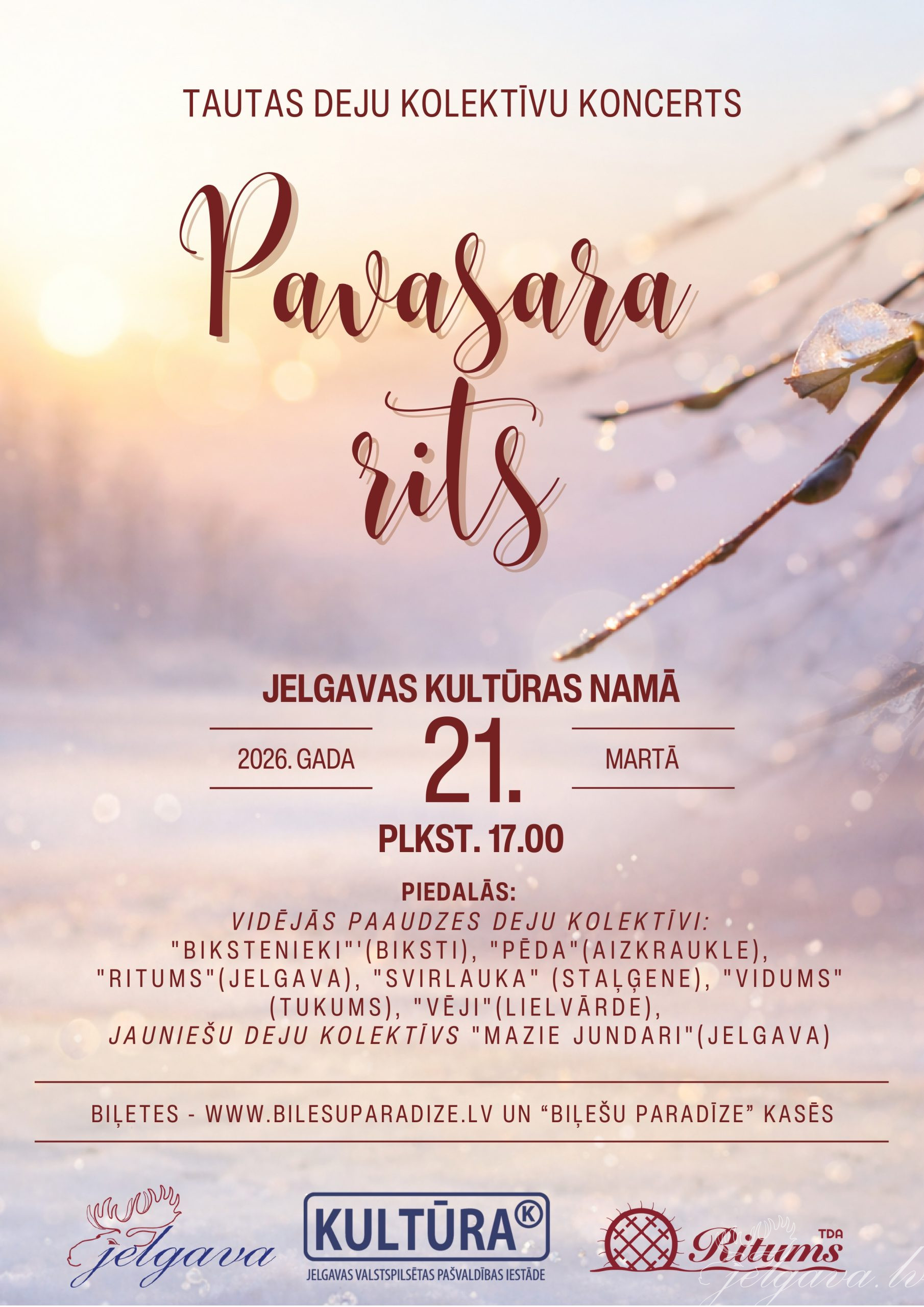 Koncertā piedalās: Vidējās paaudzes deju kolektīvi: “Bikstenieki” (Biksti), “Pēda” (Aizkraukle), “Ritums” (Jelgava), “Svirlauka” (Staļģene), “Vidums” (Tukums), “Vēji” (Lielvārde), jauniešu deju kolektīvs “Mazie Jundari” (Jelgava). Biļetes cena 6, 5 €.
