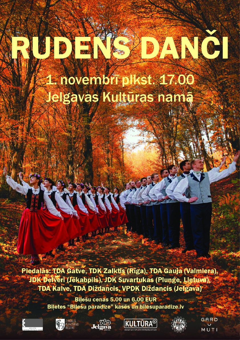 Tradicionāli, jau 20. reizi, Jelgavas Kultūras namā pulcēsies tautas deju kolektīvi, lai satiktos un “Rudens danču” virpulī ierautu arī skatītājus. Koncertā piedalās: JDK Delveri (Jēkabpils), TDA Gatve (Rīga), TDA Gauja (Valmiera), TDA Kalve (Jelgava), JDK “Suvartukas” (Plunge, Lietuva), TDK “Zalktis” (Rīga), TDA Diždancis un VPDK Diždancis (Jelgava). Koncerta mākslinieciskā vadītāja Ieva Karele. Koncerta režisors Sandis Kalniņš.