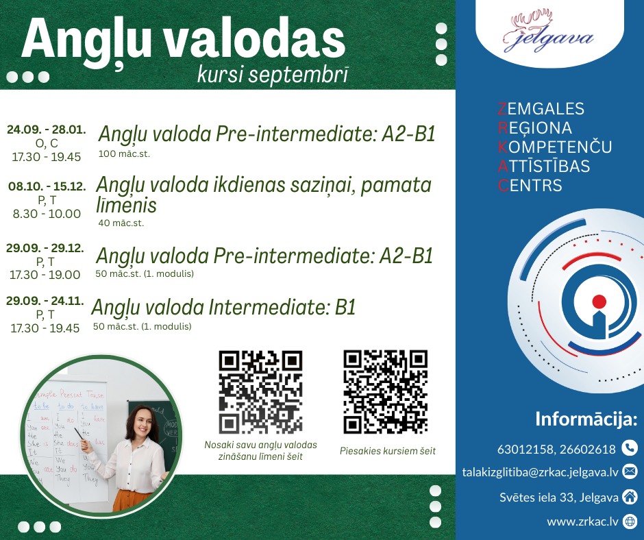 Dalībnieki apgūs saziņas pamatprasmes, lai varētu saprasties angliski runājošā vidē ikdienā bieži sastopamās ikdienas un profesionālās darbības situācijās: ceļojums, komandējums, starptautiskā saziņa. Pieteikšanās pa tālruni 63012158, 26602618 vai e-pastu talakizglitiba@zrkac.jelgava.lv.