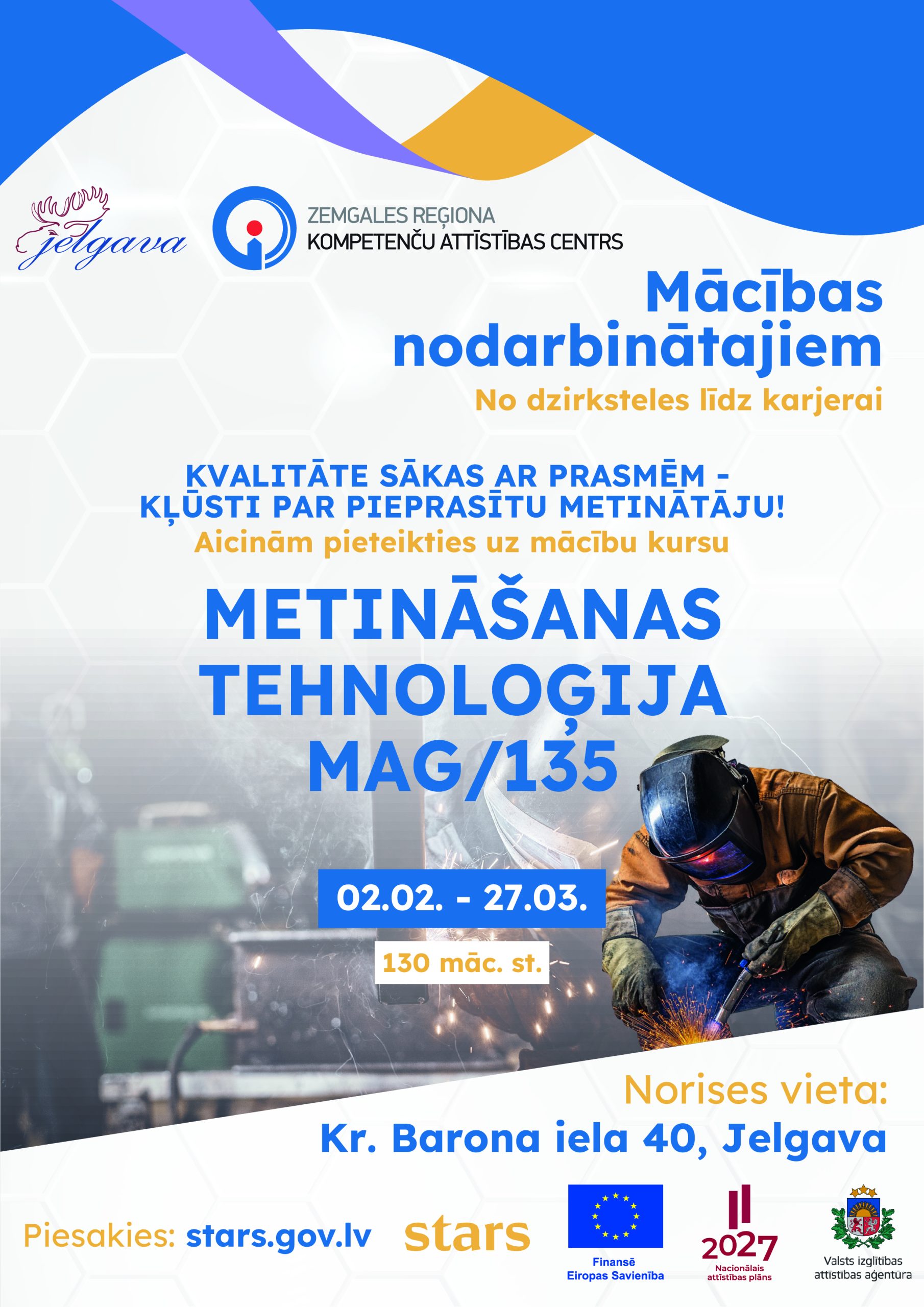 Nodarbinātajiem un pašnodarbinātajiem no 18 gadu vecuma ar Eiropas Sociālā fonda Plus un valsts budžeta līdzfinansējumu. Pieteikšanās platformā www.stars.gov.lv . Papildus informācija zvanot pa tālruni 27800576 vai rakstot e-pastu uz metalapstrade@zrkac.jelgava.lv .