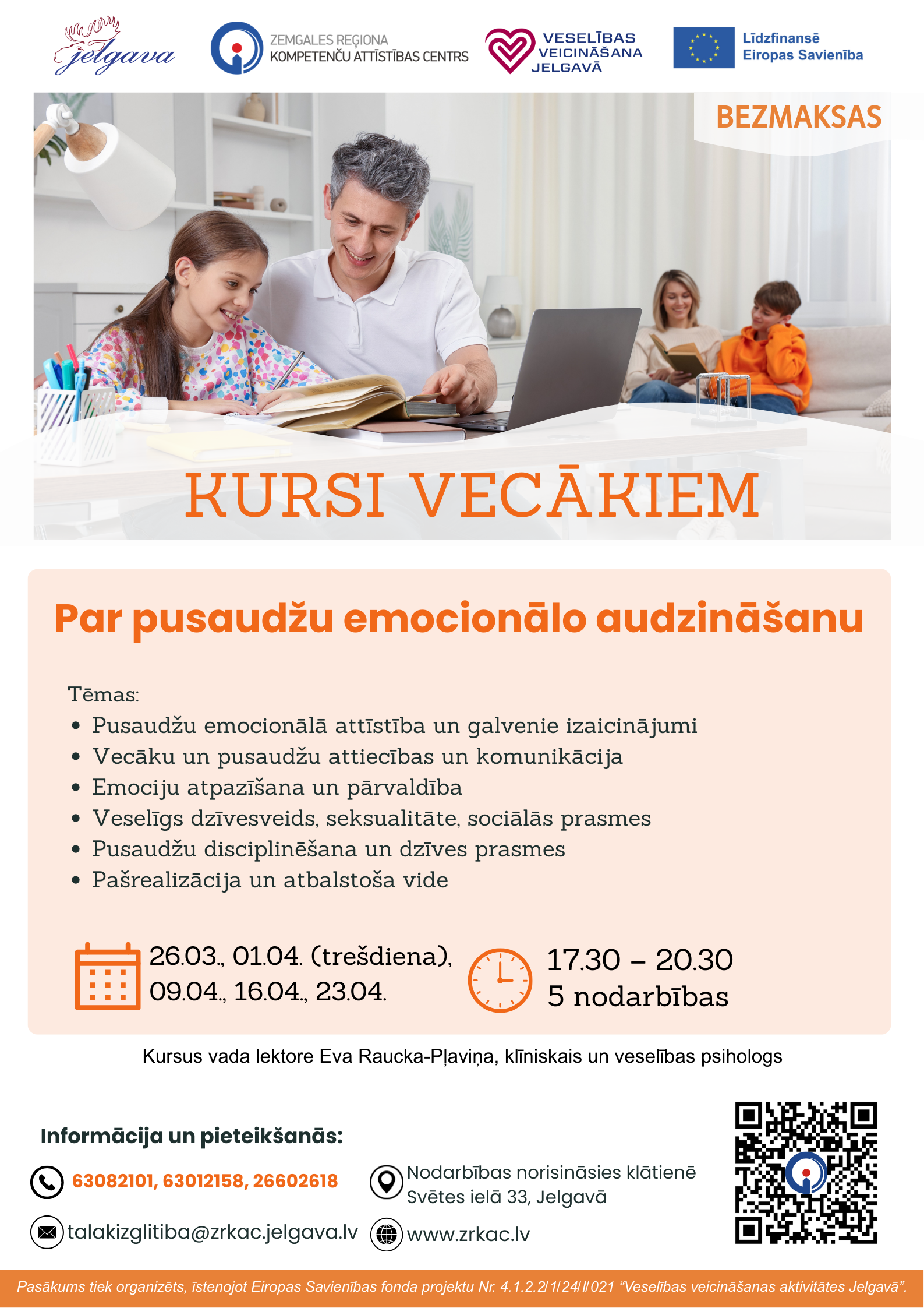 Zemgales reģiona kompetenču attīstības centrs (ZRKAC) aicina vecākus piedalīties bezmaksas kursos par pusaudžu emocionālo audzināšanu un veselību. Nodarbības norisināsies klātienē ZRKAC, Svētes ielā 33, Jelgavā, un tās vadīs klīniskā psiholoģe Eva Raucka – Pļaviņa.