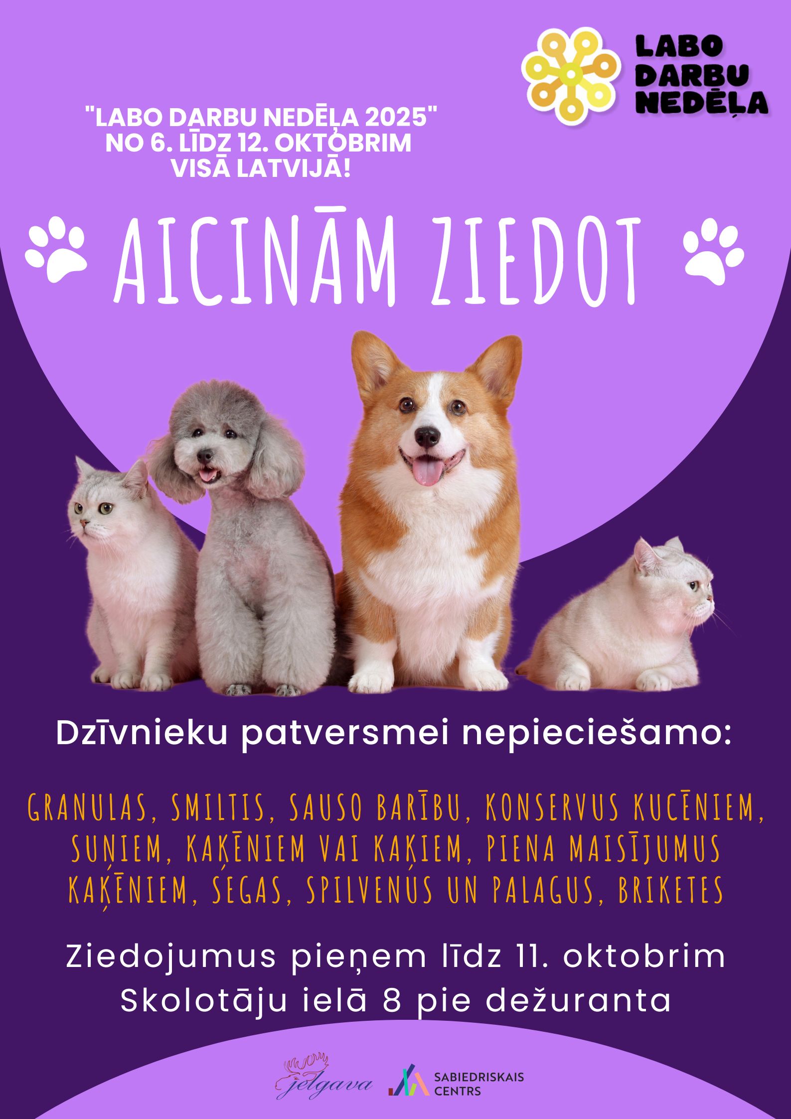 Aicina ziedot dzīvnieku patversmei nepieciešamo. Ziedojumus pieņem līdz 11. oktobrim Skolotāju ielā 8 pie dežuranta.