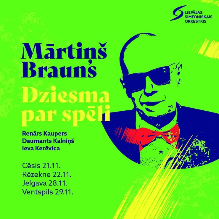 Mārtiņš Brauns. Dziesma par spēli. Koncertā Liepājas Simfoniskais orķestris diriģenta Andra Veismaņa vadībā kopā ar solistiem Renāru Kauperu, Daumantu Kalniņu un Ievu Kerēvicu izspēlēs gan smeldzīgi melanholiskās, gan ironiski jauneklīgās dziesmas, kas iekarojušas daudzu sirdis: “Dziesma par spēli”, “Daugaviņa”, “Dzied’ ar mani tautu meita”, “Es nesatiku”, “Lielais Alberts”, “Mīla ir kā uguns”, “Mūžīgā pilsēta” un citas. Emīla Zilberta meistarīgi veidotās simfoniskās aranžijas atklāj Brauna daiļrades daudzpusību, savijot populāro mūziku ar akadēmiskās mūzikas niansēm un piedāvājot aizraujošu ceļojumu leģendārā latviešu komponista mūzikas pasaulē.