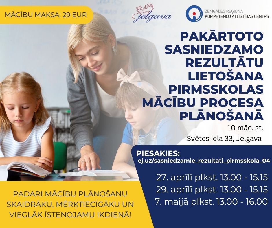Iegūtas zināšanas sasniedzamo rezultātu diferencēšanā un pedagoģiskā procesa plānošanā. Apgūtas prasmes pakārtoto sasniedzamo rezultātu izvirzīšanā pirmsskolas mācību procesa plānošanā un vērtēšanā. Dalības maksa – 29 EUR. Pieteikšanās: https://ej.uz/sasniedzamie_rezultati_pirmsskola_04. Papildus informācija zvanot pa tālruni 63012154, 26195773 vai rakstot e-pastu uz dace.petersone-gutmane@zrkac.jelgava.lv.