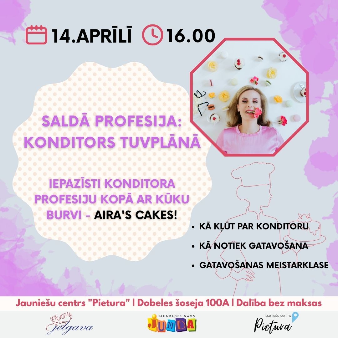 Jauniešiem būs iespēja iepazīties ar konditora profesiju, uzzinot par darba specifiku, nepieciešamajām prasmēm un karjeras iespējām. Iepriekšēja pieteikšanās nav nepieciešama.