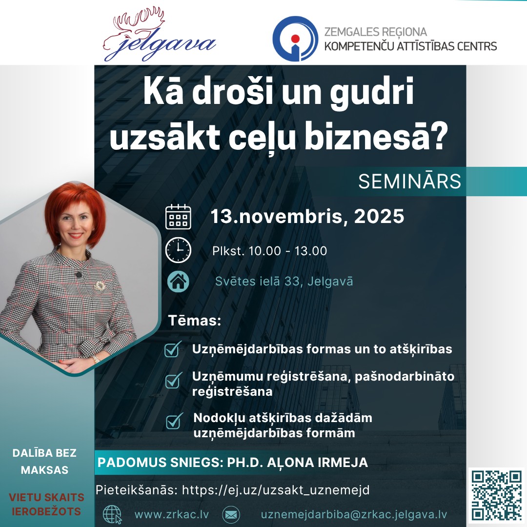 Semināru vada Ph.D. Aļona Irmeja. Dalība – bez maksas. Pieteikšanās saite: ej.uz/uzsakt_uznemejd kā arī zvanot pa tālruni 63012155, 63012169 vai rakstot e-pastu uznemejdarbiba@zrkac.jelgava.lv