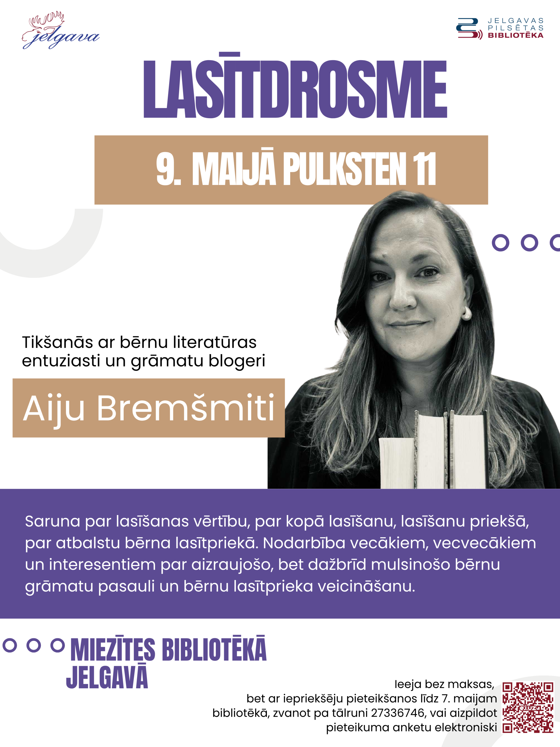 Tikšanās ar bērnu literatūras entuziasti un grāmatu blogeri Aiju Bremšmiti nodarbībā “Lasīdrosme”. Saruna par lasīšanas vērtību, par kopā lasīšanu, lasīšanu priekšā, par atbalstu bērna lasītpriekā. Nodarbība vecākiem, vecvecākiem un interesentiem par aizraujošo, bet dažbrīd mulsinošo bērnu grāmatu pasauli un bērnu lasītprieka veicināšanu. Ieeja bez maksas, bet ar iepriekšēju pieteikšanos līdz 7. maijam bibliotēkā, zvanot pa tālruni 27336746, vai aizpildot pieteikuma anketu elektroniski: https://ej.uz/aijas_bremsmites_lekcija