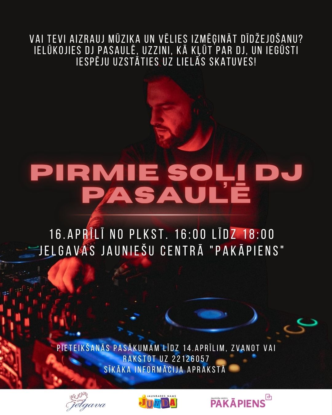 Ja Tevi aizrauj mūzika un interesē dīdžejošana, šī ir iespēja ne tikai izmēģināt spēkus aiz DJ pults, bet arī satikt pieredzējušu nozares pārstāvi – DJ Mike Discoid – un uzzināt vairāk par DJ profesijas aizkulisēm. Jauniešu centrā notiks ne tikai tikšanās ar jau pieredzējušu profesijas pārstāvi, bet arī DJ atlase, kurā aicināts piedalīties ikviens jaunietis – gan tie, kuri vēlas spert pirmos soļus dīdžejošanā, gan tie, kuriem jau ir pieredze. Dalībniekiem būs iespēja darboties drošā un atbalstošā vidē, izmēģināt savu muzikālo gaumi praksē, attīstīt tehniskās un radošās prasmes, kā arī iegūt vērtīgu skatuves pieredzi. Tāpat būs iespēja uzdot jautājumus, saņemt ieteikumus un iedvesmoties no profesionāļa pieredzes stāstiem.