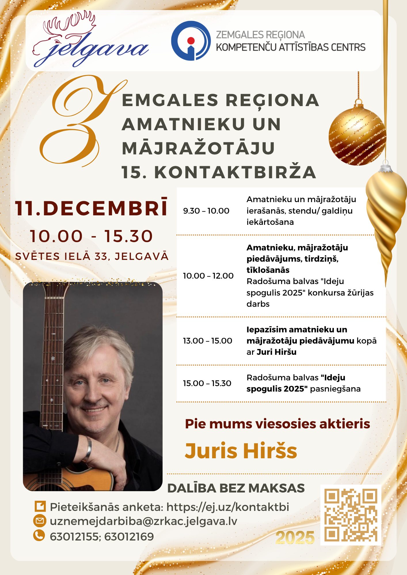 Šī gada īpašais pasākuma viesis aktieris Juris Hiršs, kas no plkst. 13.00 līdz 15.00 klātesošos iepazīstinās ar amatnieku un mājražotāju piedāvājumu, vienlaikus priecējot ar muzikāliem priekšnesumiem. Amatnieki un mājražotāji aicināti pieteikties dalībai pasākumā līdz 2. decembrim, aizpildot pieteikuma anketu: ej.uz/kontaktbi