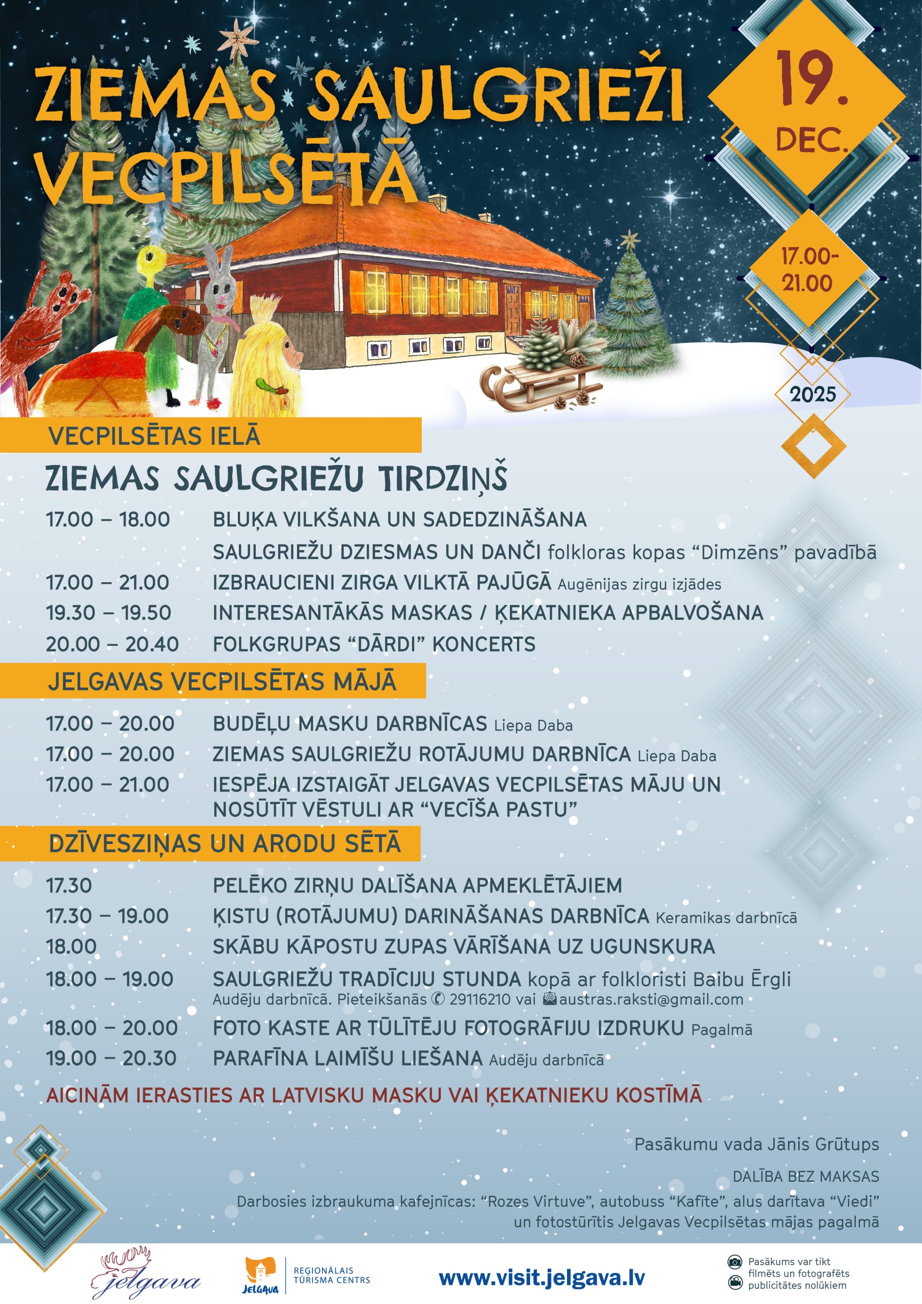 Saulgriežu sagaidīšana labākajās latviešu tradīcijās – ķekatas, maskas, muzikāli priekšnesumi, tirdziņš, zupa uz ugunskura un bluķa vilkšana. Balviņas interesantāko ķekatnieku masku nēsātājiem. Plašāka informācija būs pieejama www.visit.jelgava.lv.